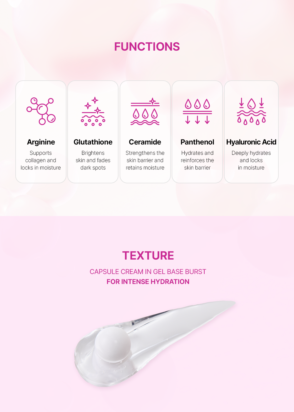 Water, Dipropylene Glycol, Glycerin, Prunus Amygdalus Dulcis (Sweet Almond) Oil, Niacinamide, 1,2-Hexanediol, Butylene Glycol, Polyglyceryl-3 Methylglucose Distearate, Squalane, Butyrospermum Parkii (Shea) Butter, Beeswax, Cetearyl Alcohol, Dimethicone, Cetearyl Olivate, Sorbitan Olivate, Hy-droxyacetophenone, Carbomer, Arginine, Palmitic Acid, Hydroxyethyl Acrylate/Sodium Acryloyldimethyl Taurate Copolymer, Stearic Acid, Allantoin, Panthenol, Olive Oil Glycereth-8 Esters, Sphingomonas Ferment Extract, Ammonium Acryloyldimethyltaurate/CP Copolymer, Pentylene Glycol, Polyglyceryl-10 Laurate, Tocopheryl Acetate, Polyglyceryl-10 Myristate, Adenosine, Disodium EDTA, Ethylhexylglycerin, Caprylyl Glycol, Fragrance, Sorbitan Isostearate, Hydrolyzed Collagen (1,000ppm), Myristic Acid, Hydroxyphenyl Propamidobenzoic Acid, Sodium Hyaluronate, Arachidic Acid, Madecassoside, Caprylic/Capric Triglyceride, Lauric Acid, Hydrogenated Lecithin, Potassium Hyalulonate, Hydroxypropyltrimonium Hyaluronate, Hydrolyzed Sodium Hyaluronate, Hydrolyzed Hyaluronic Acid, Hyaluronic Acid, Glutathione, Ceramide NP, Sodium Hyaluronate Crosspolymer, Sodium Acetylated Hyaluronate