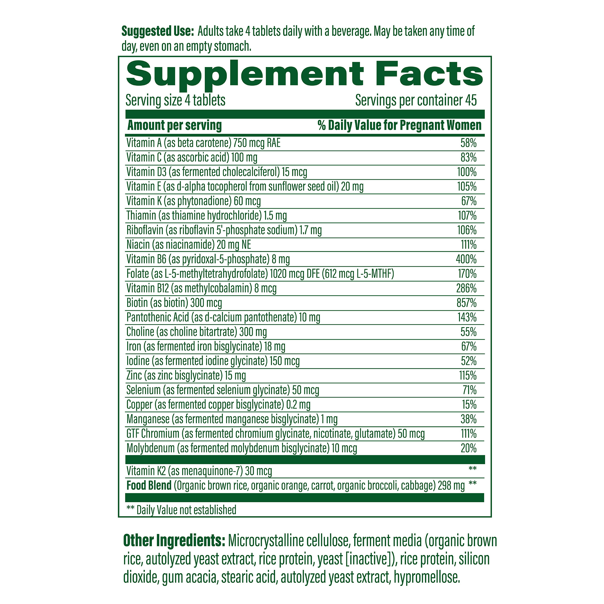 Suggested use: Adults take 4 tablets daily with a beverage. May be taken any time of day, even on an empty stomach.Non-GMO Project Verified, Vegetarian, Certified Kosher, Gluten-Free, Made without 9 food allergens, Tested for 150+ Pesticides
