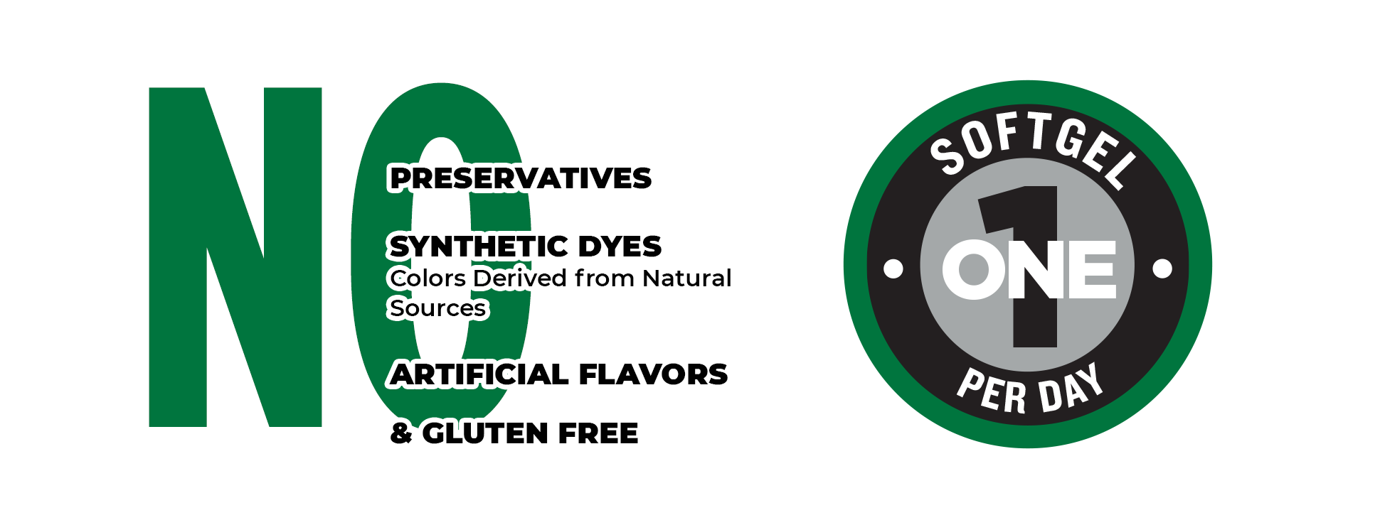 No preservatives, no synthetic dyes – color derived from natural source, no artificial flavors, gluten free. 1 softgel per day.